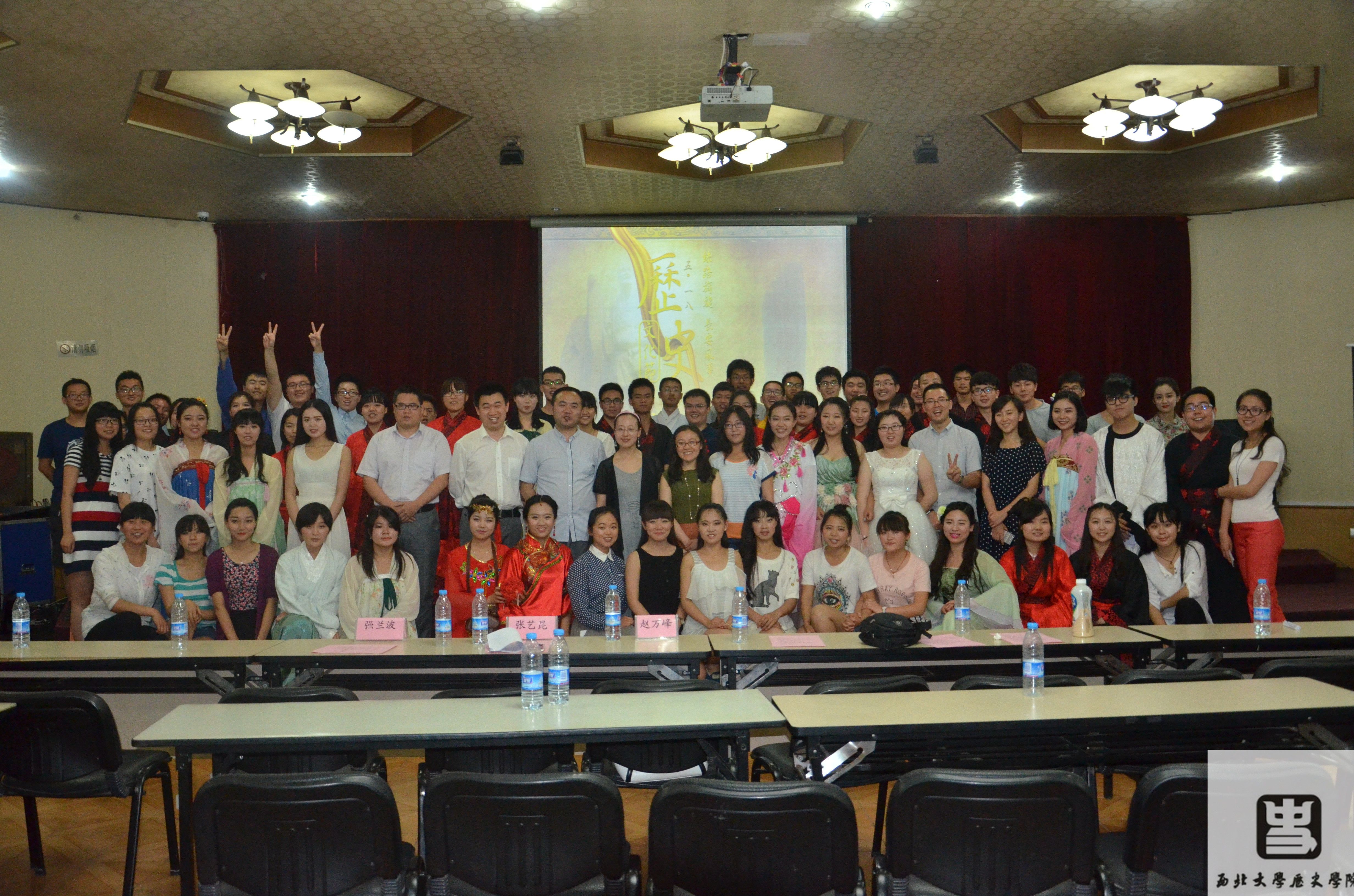 为庆祝2014622日,由中哈吉三国联合申报的丝绸之路长安天山廊道网成功申报世界文化遗产,我院此次特以丝路旖旎,长安风华为主题,举办5.18历史文化节。在掌声雷动中,5.18历史文化节闭幕晚会以一支古典舞开场,之后还有歌曲《丝路》、古筝表演《北方有佳人》、话剧《凿空西域》、新疆民歌弹唱、书韵、西域舞蹈串烧、唐长安情景剧、古筝表演《春江花月夜》、歌曲《龙文》、诗经吟诵、古典舞蹈《雅乐寻踪》等精彩节目,不断将晚会气氛推向高潮。最后,晚会在由西北大学历史学院 爱渡志愿者团体集体演唱的《贞观长歌》中落下了帷幕。其中话剧《凿空西域》以张骞出使西域为背景,结合史料,加上同学们精湛的演技,真实有力地反应出西汉初期张骞为联合大月氏夹击匈奴而出使西域这一史称凿空西域的历史事件,赢得了观众的阵阵喝彩。表演期间,历史学院还特地推出微信墙互动平台,加强了观众的参与度,为晚会增添了许多乐趣。
