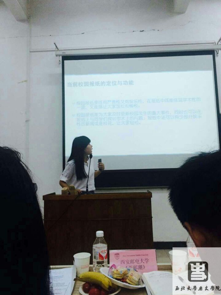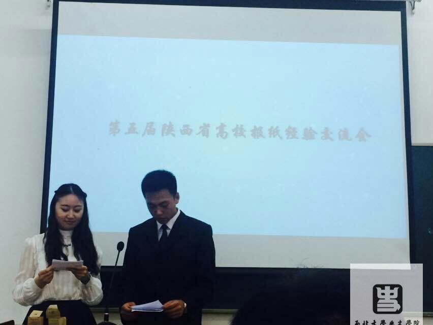 在当下的信息时代,纸媒的生存道路越来越窄,但纸媒作为一种传统传媒,经得起历练,必有过人之处。陕西省第五届高校报纸交流会本着交流纸媒发展经验,促进高校间的友好关系,增进办报信心的目的应愿召开。会议共分会前准备、欢迎致辞,经验交流三个环节。我院的宣传部的张馨、贾铭睿同学参加了此次会议,会前准备期间,她们给各与会院校代表赠送了我院报纸《望族》;经验交流环节,张馨同学代表我院上台,作了《当前校园报纸的定位与功能》的演讲,准确的描述出了当前校园报纸的现状与功能,有利于我们认清当前校园报纸的发展状况。