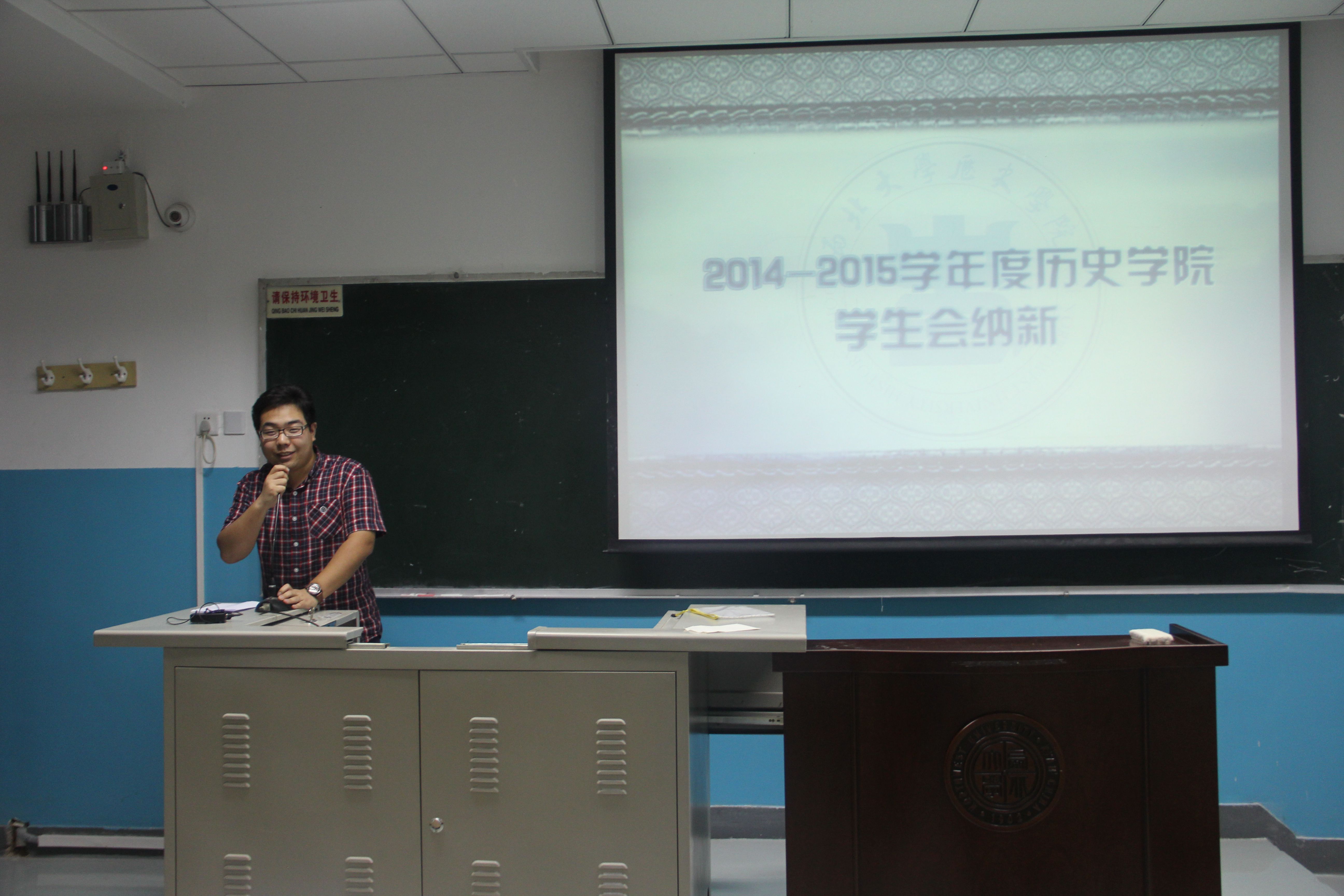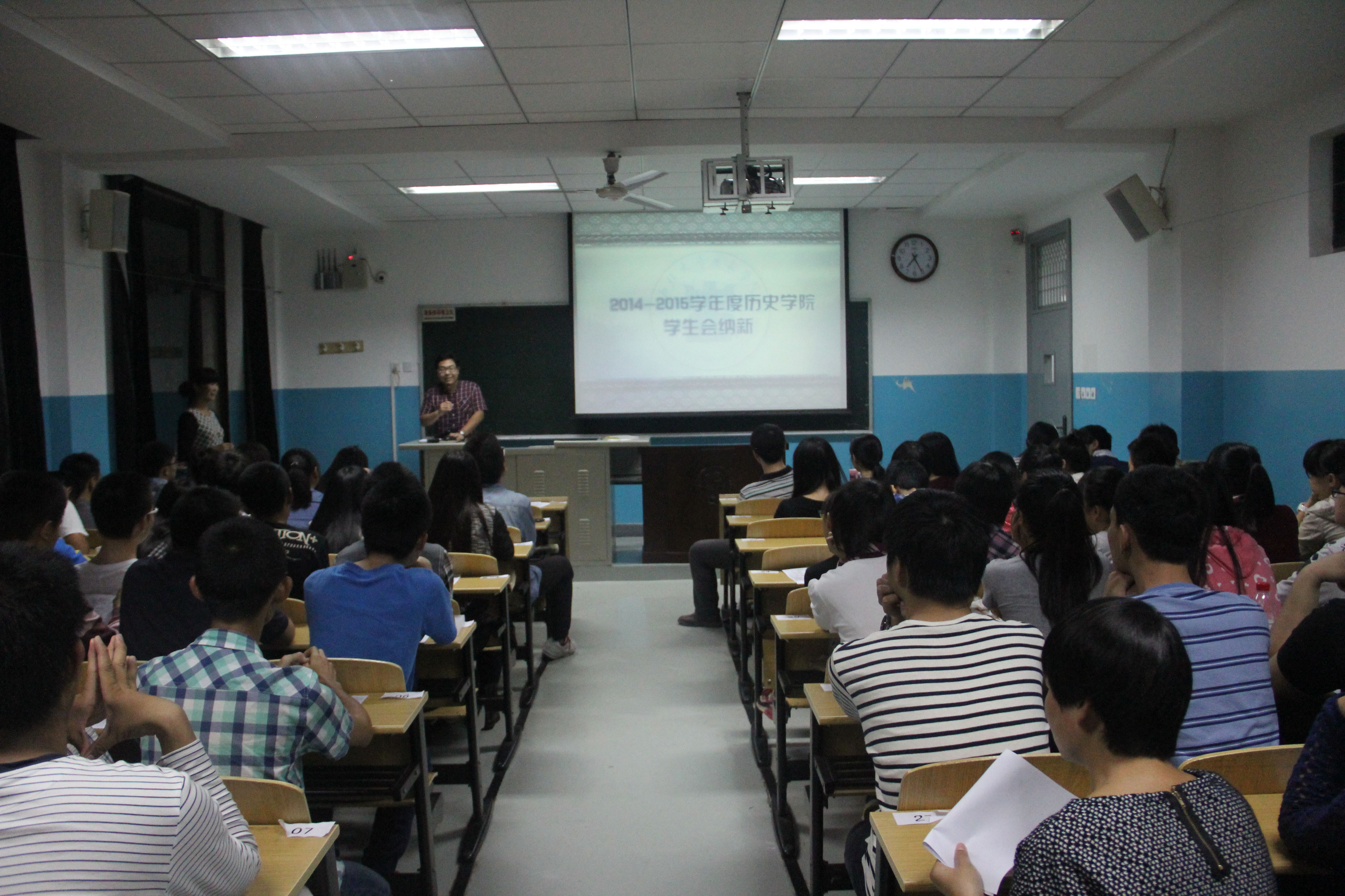 922日晚7点,在7205教室举行了2014-2015年度历史学院学生会纳新大会。首先,历史学院团委书记薛老师做了一番讲话。他以幽默诙谐的风格,为大一新生讲述了大学生活和学生会的意义。接下来是学生会主席魏秦星学长发言。他向我们讲述了他对大学的认识,分享了学生会的乐趣,吸引同学们加入学生会。副主席刘洋学长、梅嘉妮学姐和饶美娟学姐分别介绍了他们主管的部门。