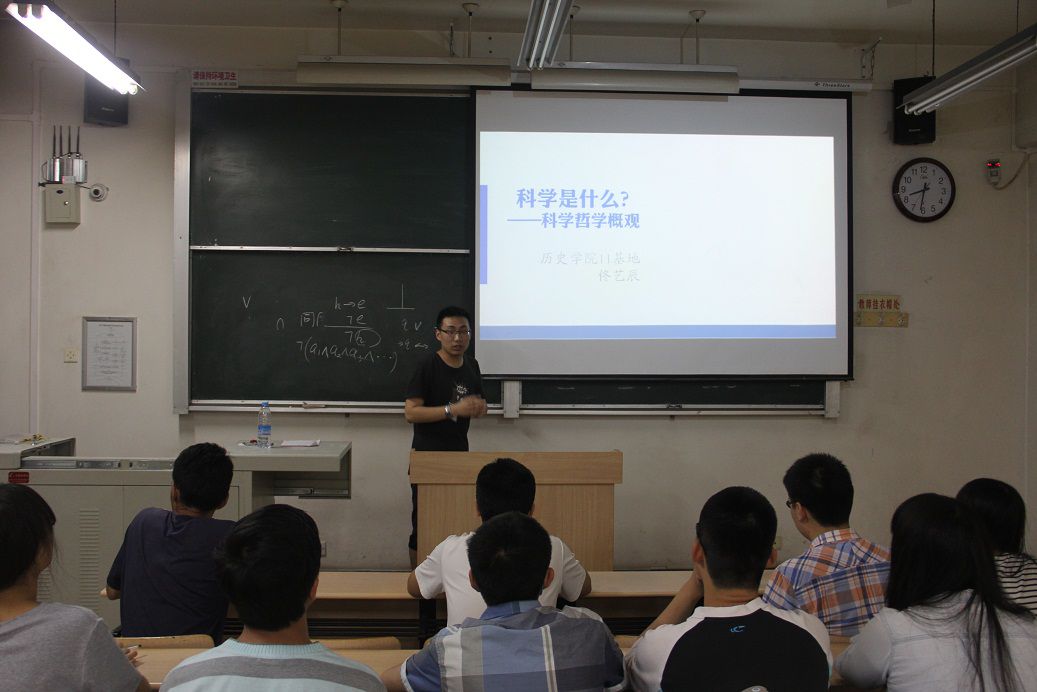 2014518日晚七时,在我校太白校区9303教室,由《史林新苗》杂志主编,我院2011级历史基地班的佟艺辰同学担任主讲,学习部主办学术交流会第四期“科学是什么——科学哲学概观”顺利召开。