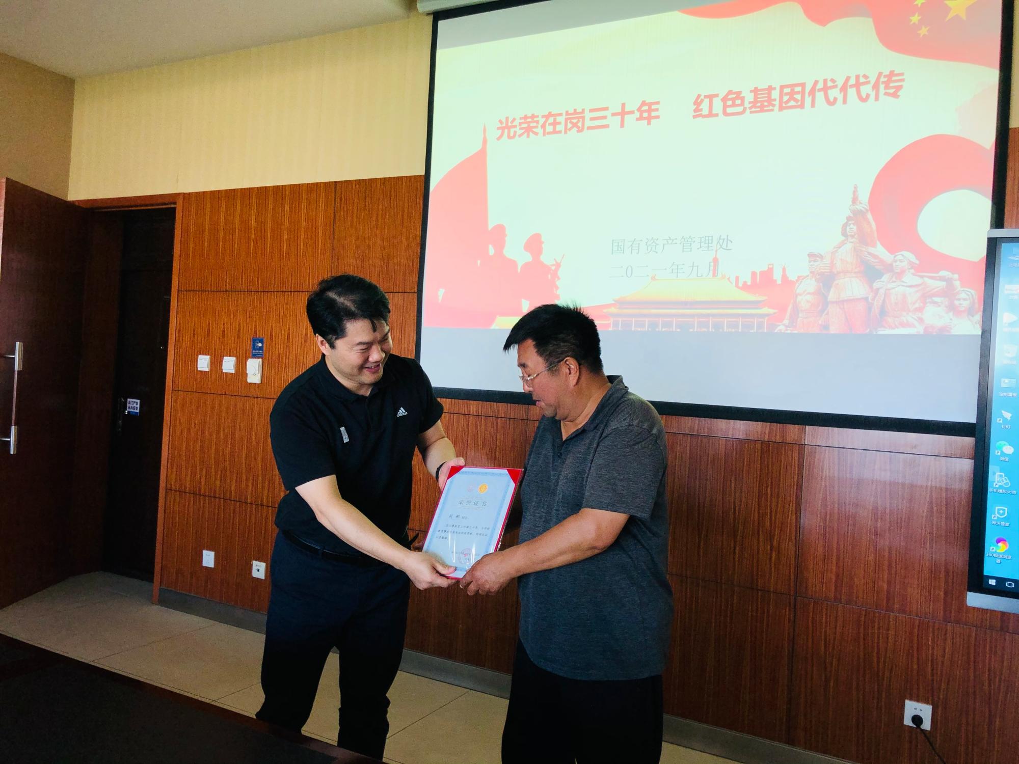 (通讯员 郝思嘉)2021年9月14日,伟德官网全处会议在办公楼603召开。今年,是中国共产党成立一百周年,也是老党员刘彬爱岗敬业工作的第三十六年。会议上,伟德官网处长于海涛给刘彬颁发光荣工作三十年荣誉证书及鲜花礼品,感谢他为伟德官网多年的辛勤付出。