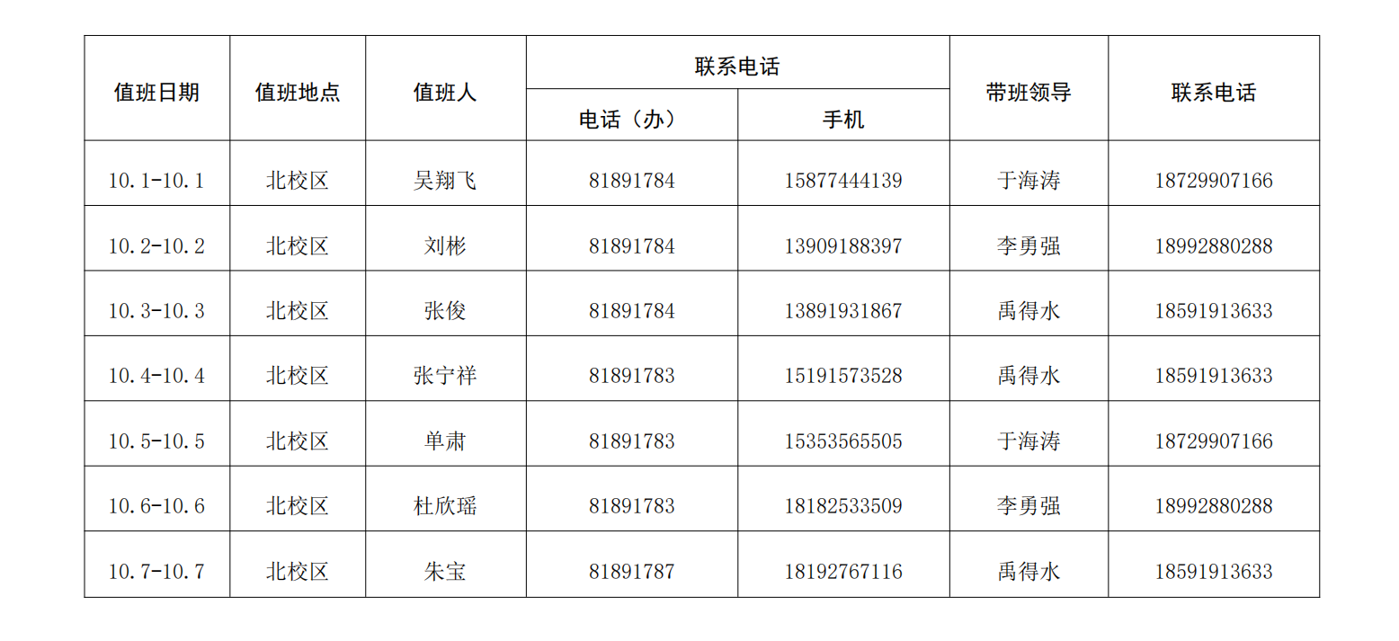 根据《伟德官网关于2021年国庆放假时间安排的通知》安排,2021年国庆节放假时间为10月1日至10月7日,共7天。假期期间,我单位值班安排如下: