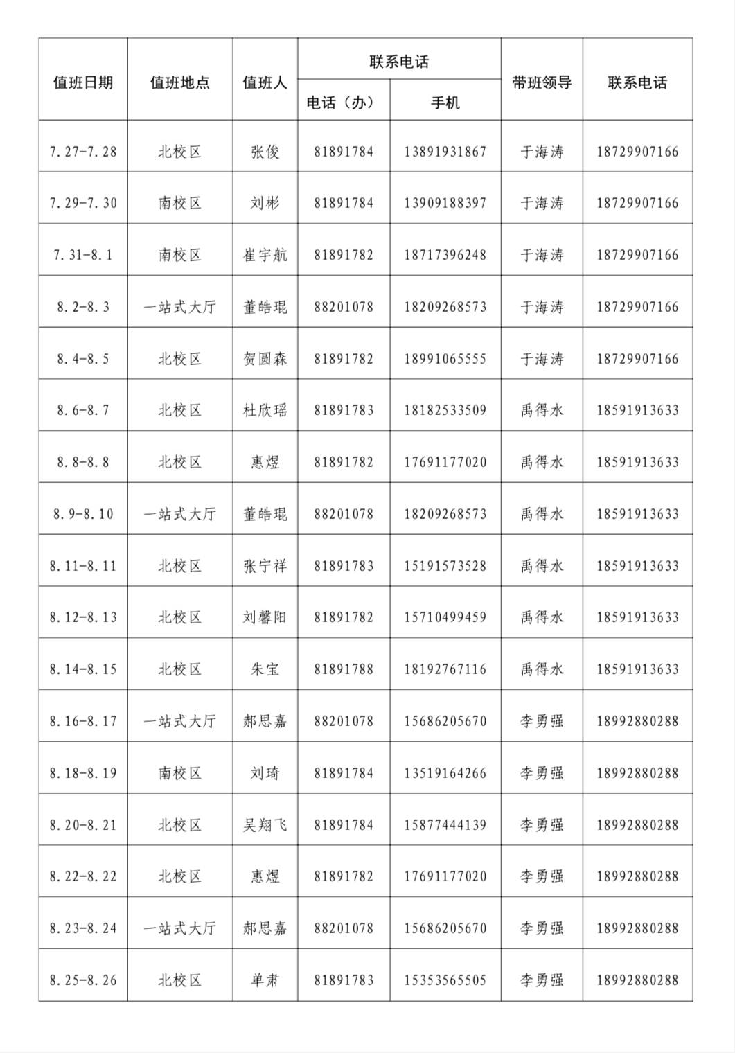 根据《伟德官网关于2021年暑假放假时间安排的通知》(西电办[2021]3号)安排,2021年暑假放假时间为7月27日至8月26日,共31天。假期期间,我单位值班安排如下: