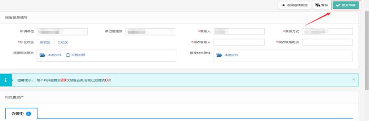 修改回收联系人、回收联系电话并选择校区,填写设备的报废原因,提交报废申请