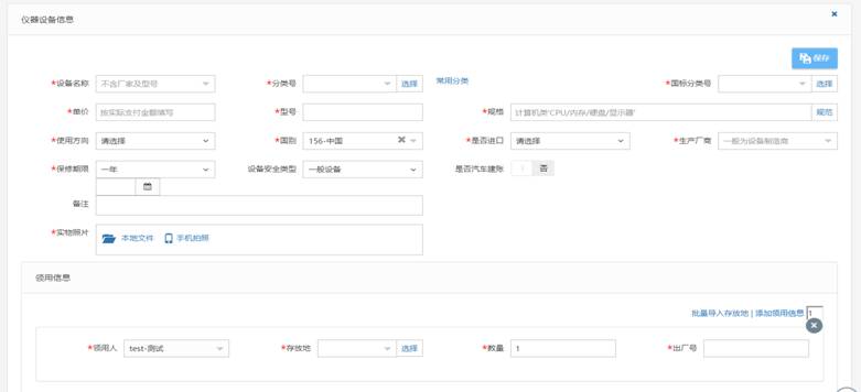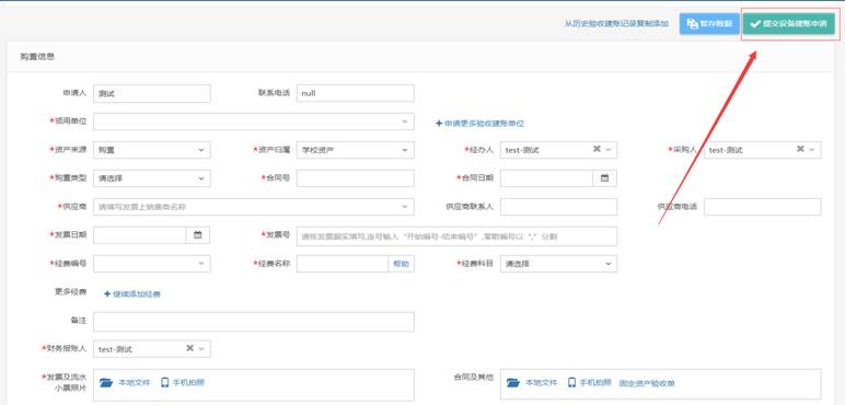 用户完善资产购置信息,和具体的资产基本信息后,点击“保存”按钮,在录完所有需要验收的资产后,点击右上角的“提交设备建账申请”按钮。如下图所示:
