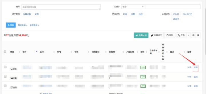 进入“个人业务→我领用的资产”菜单下,点击“退回”,如下图: