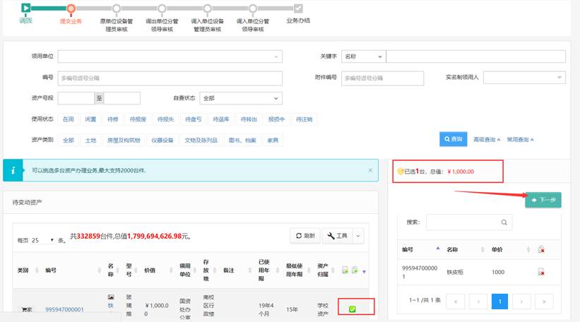 通过查询条件找到需要调拨的设备,勾选后点击“下一步”按钮,如下图: