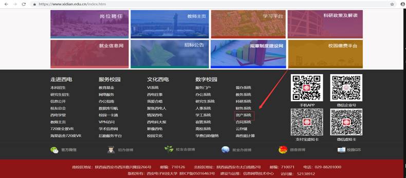 用户打开浏览器,进入伟德官网官网https://www.xidian.edu.cn/,在官网首页下方可以看到“资产系统”,点击 “资产系统”,输入学校