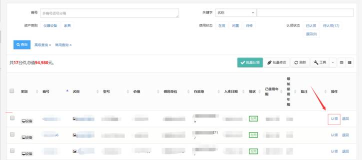 进入“个人业务→我领用的资产”菜单下,点击“认领”,如下图: