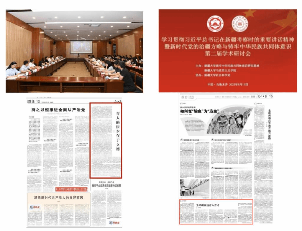 哲学社会科学领域积极贯彻落实习近平总书记视察新疆大学时的讲话精神。一是举办系列研讨会。分别举办了“育人的根本在于立德”专题研讨会和“学习贯彻习近平总书记在新疆考察时的重要讲话精神暨新时代党的治疆方略与铸牢中华民族共同体意识第二届学术研讨会”,来自全国各地的专家参与了研讨。二是深入研究阐释。大学党委书记许咸宜在人民日报、光明日报分别发表题为“育人的根本在于立德”“为兴疆固边育人育才”的文章,学校专家学者围绕总书记的讲话精神撰写各类学术文章共30余篇,掀起了学习贯彻习近平总书记重要讲话精神的热潮。三是发挥思政课主渠道作用。通过集体备课,召开专题教学研讨会等形式贯彻落实习近平总书记的重要讲话精神。先后举办“开好讲好新疆地方思政课 推动学校铸牢中华民族共同体意识教育”《思想道德与法治》课程专题教学研讨会。