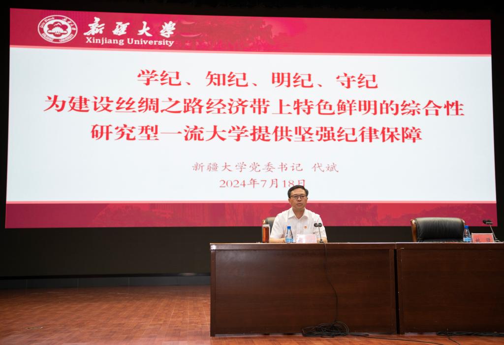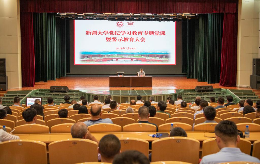 7月18日下午,新疆大学在红湖校区大学生科技文化活动中心召开党纪学习教育专题党课报告会暨警示教育大会,校党委书记代斌出席会议并讲授专题党课,校党委副书记、校长姚强主持会议。全体在家校领导、全体处级干部参加会议。