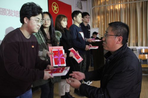 赵万峰、樊涛向学员代表赠予《团支部活动记录本》、《团章》及相关学习书籍资料。
