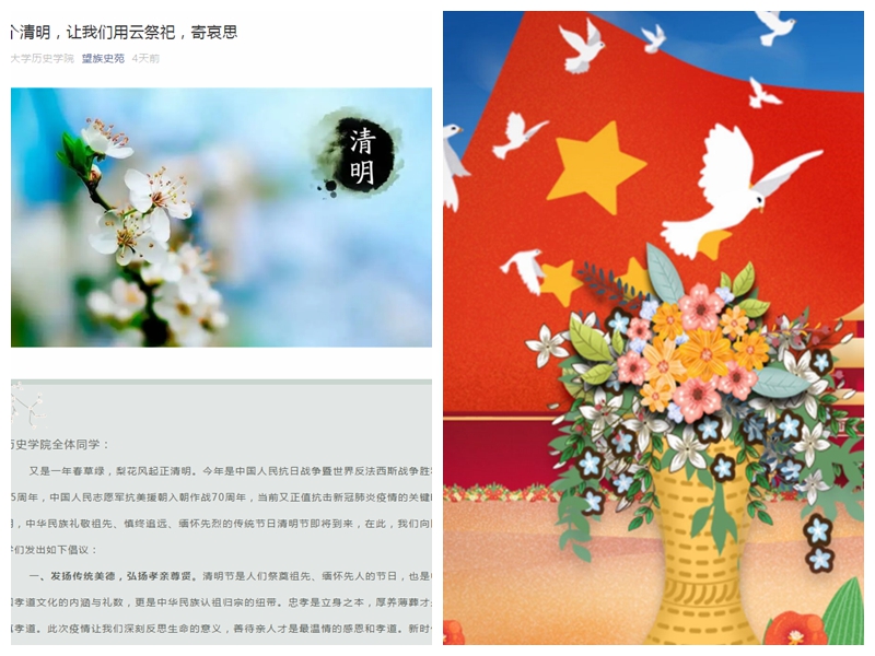 清明节前,学院团委向广大青年学子发出倡议,引导大家在抗击新冠肺炎疫情的关键时期,通过云祭祀等亲身行动铭记英雄先烈,弘扬孝道亲情,感恩自然馈赠。上午10点,历史青年们在各地自觉为牺牲烈士和同胞默哀3分钟,大家在防空警报盘旋不止的哀鸣中寄托了对英烈们的哀思与缅怀,更以烈士们的无私无畏精神浇铸自身,与自己肩扛的光荣使命产生了深深共鸣。