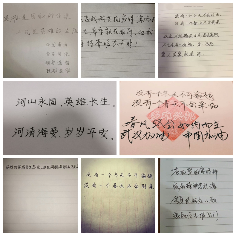 2019级各团支部通过主题团日活动学习李文亮等14人被评为烈士的具体事迹和以杨拯陆、郭峰烈士为代表的西大优秀英模人物事迹,广大团员青年们纷纷登录中华英烈网“清明祭英烈”等网络专栏进行网上祭扫英烈活动,学习革命先烈的英雄事迹和伟大精神,写下感言寄语,学习新冠肺炎疫情防控牺牲烈士用生命守护生命、用生命践行使命、用生命书写担当的崇高精神,通过手写祝福等形式表达了对抗疫前线的祝福和对抗疫英烈的哀思。
