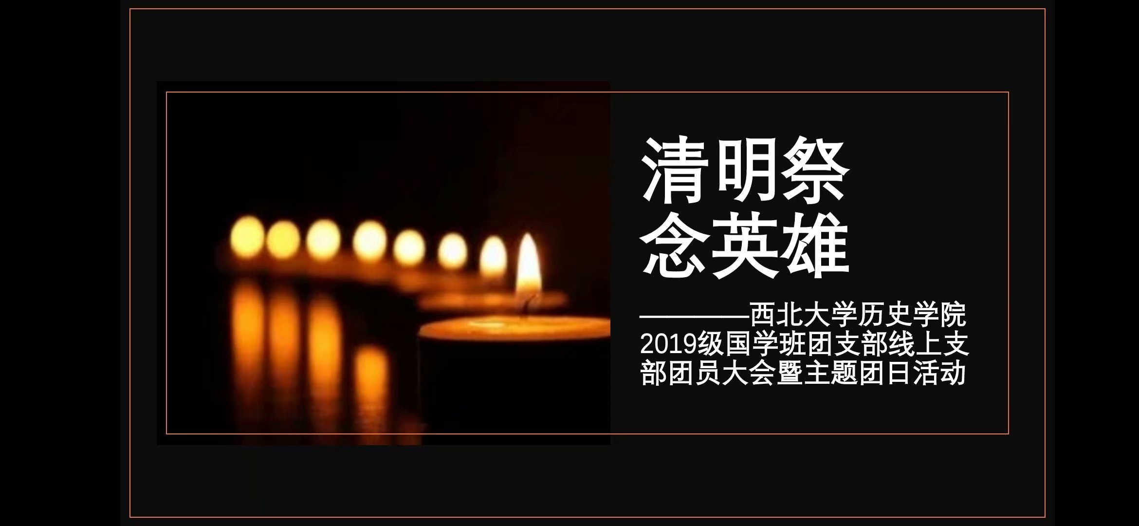 这次的清明节祭烈士主题团课让我感受很深。受新冠疫情影响,只能采用网络祭奠的线上方式,又适逢本次疫情牺牲的所有公职人员被追授为烈士的特殊节点,这次团课显得意义非常。我身为西北大学的一名学生,也为西大前辈们英勇奉献的事迹感动。历史终将记住他们,而我们这一代青年也更要把民族复兴的重担挑在肩上,学习前辈们艰苦奋斗的精神,让拼搏成为人生的底色。