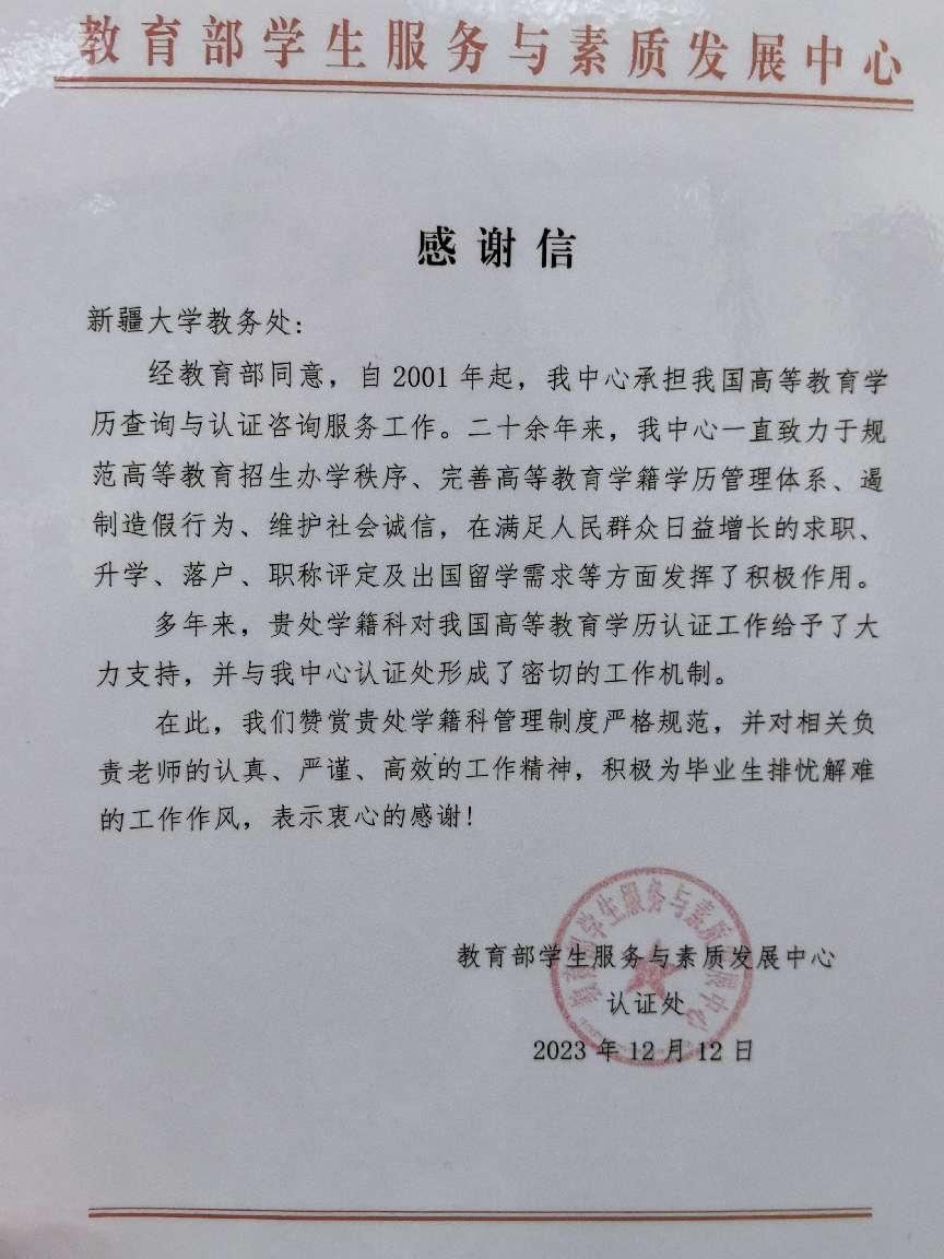 12月12日,教育部学生服务与素质发展中心向教务处发来《感谢信》,特对新疆大学教务处学籍科学籍管理工作提出表扬。教育部学生服务与素质发展中心赞赏我校学籍科对高等教育学历认证工作给予的大力支持,认为我校学籍管理制度严格规范,相关负责老师认真、严谨、工作作风扎实,满足了毕业校友在求职、升学、落户、职称评定及出国留学等方面的学历认证需求。