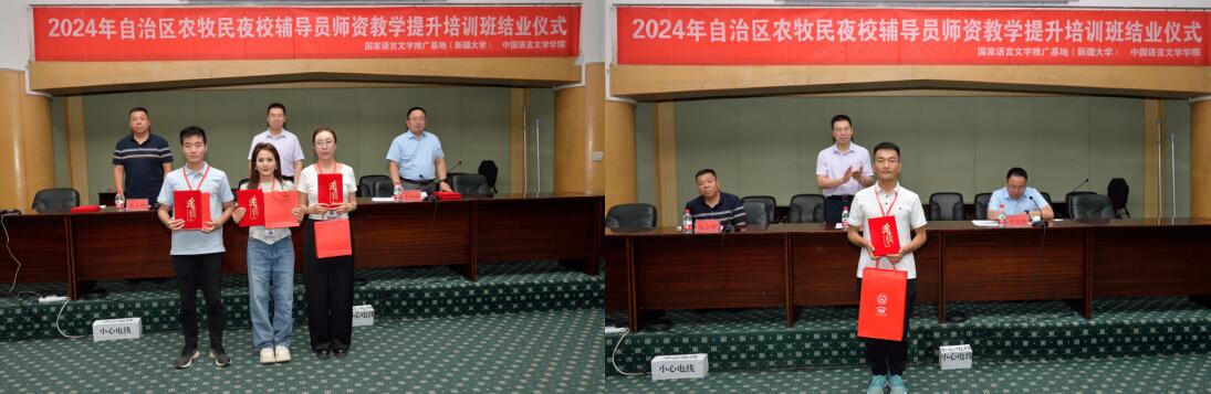 新疆大学党委常委、副校长、教务处处长、国家语言文字推广基地(新疆大学)主任刘正江教授,新疆大学中国语言文学学院党委书记李凤华,来自和田地区、昌吉州的120名夜校辅导员和国家语言文字推广基地(新疆大学)培训师资团队、助教团队全体成员参加了结业仪式。结业仪式由国家语言文字推广基地(新疆大学)副主任高立明主持。
