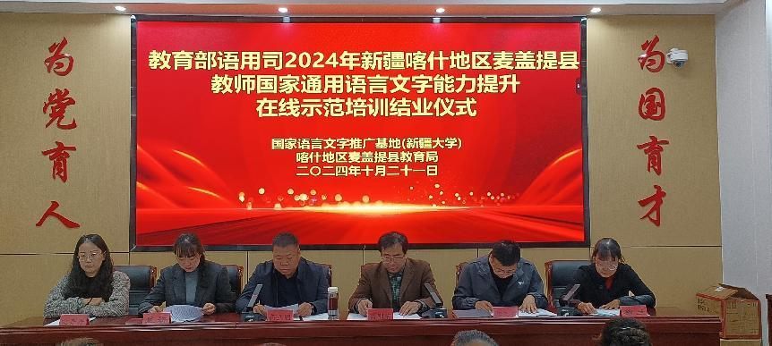 10月21日,由教育部语言文字应用管理司组织实施的“2024年新疆喀什地区麦盖提县教师国家通用语言文字能力提升在线示范培训班”结业仪式在麦盖提县实验中学顺利举行。新疆大学中国语言文学学院副院长葛刚岩、喀什地区麦盖提县教育局党组成员、项目服务中心主任郝天亮、国家语言文字推广基地(新疆大学)副主任高立明、办公室主任焦妍、秘书宋丹丹、麦盖提县教师培训中心副主任穆兰及麦盖提县的50名参训教师参加。结业仪式由穆兰副主任主持。