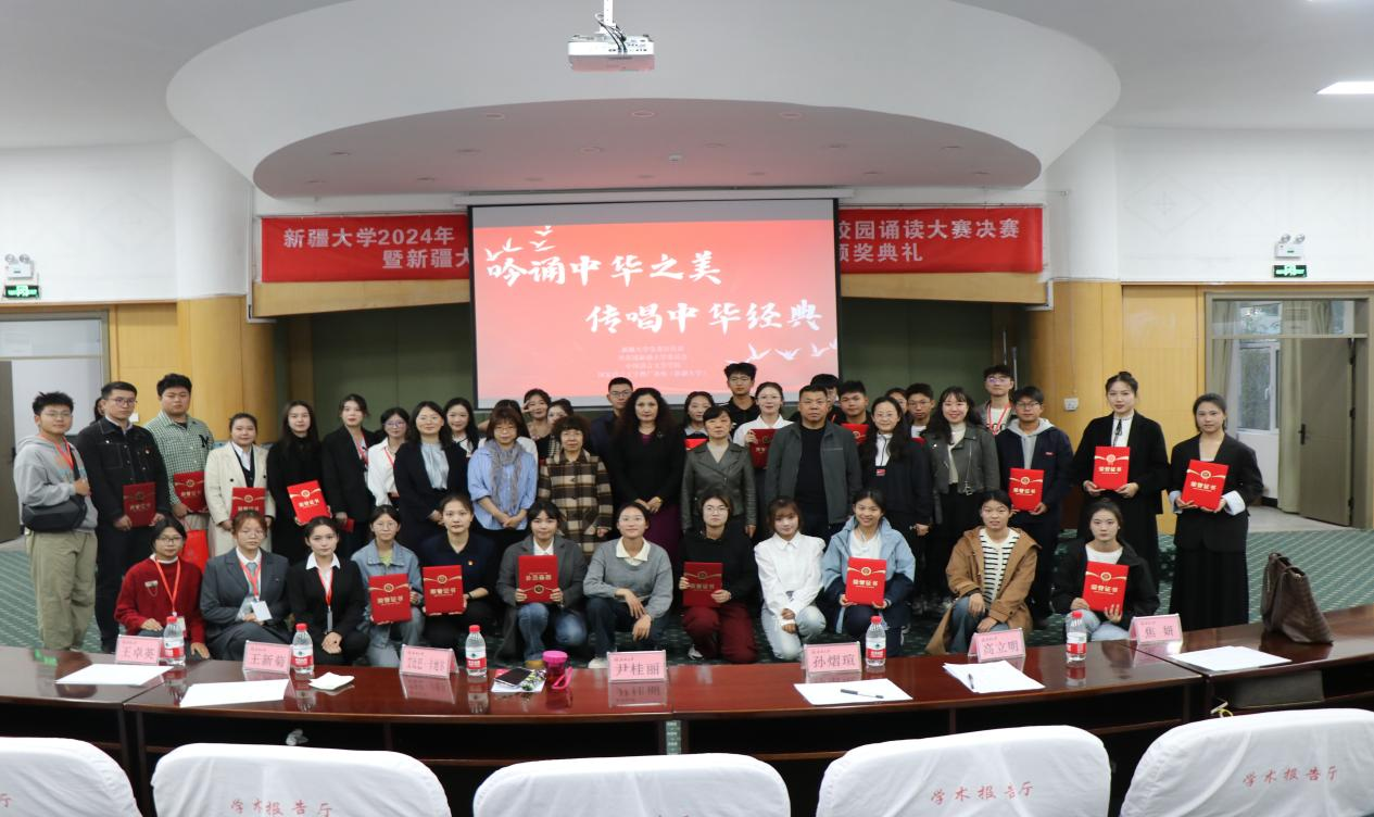 10月16日下午,第27届推普周系列活动之中华经典诵读大赛在新疆大学九号楼学术报告厅启幕。本次活动由新疆大学党委宣传部、共青团新疆大学委员会、新疆大学中国语言文学学院、国家语言文字推广基地(新疆大学)共同举办。新疆大学党委宣传部孙熠瑄老师,共青团新疆大学委员会艾比巴·卡地尔老师、中国语言文学学院尹桂丽教授、王新菊副教授、王卓英副教授、国家通用语言文字推广基地(新疆大学)副主任高立明副教授、国家通用语言文字基地(新疆大学)办公室主任焦妍老师担任此次大赛的评委,中国语言文学学院副院长葛刚岩副教授出席并致辞。葛刚岩副院长向与会师生现场阐释了何为“经”“典”,就吟诵之道展开讲解,并在致辞中深情阐述:“中华经典是中华民族的辉煌,是中华民族的灵魂。通过诵读经典,我们可以传承中华民族优秀品德,弘扬中华民族精神,增强文化自信,营造书香校园,促进校园文化建设。在欣赏中华经典独特魅力的同时还感受到同学们热爱中华文化的真挚情感,这已经不仅只是一场比赛了,更是精神的洗礼。”他表示,中华民族源远流长、博大精深的传统文化为世人留下了宝贵的精神遗产,希望同学们可以通过学习、诵读经典诗文,学习到更多语言和文化知识,深入地感受领悟中华经典,感受到中国语言和文化的魅力,进一步加深对中华优秀文化传统的了解和热爱。