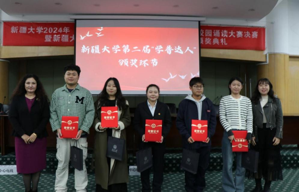 10 月 16 日下午,新疆大学第二届“推普达人”颁奖活动于九号教学楼二楼学术报告厅举行,共青团新疆大学委员会艾比巴·卡地尔老师、国家语言文字推广基地(新疆大学)副主任高立明副教授、国家语言文字推广基地(新疆大学)办公室主任焦妍老师出席颁奖式并为获奖人员颁发了荣誉证书和奖品。