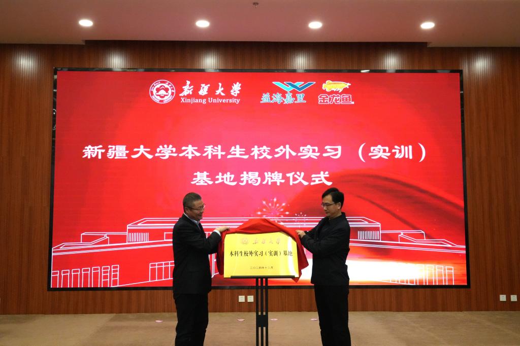 新疆大学教务处副处长付再学与益海嘉里金龙鱼昌吉粮油总经理白宇为“新疆大学本科生校外实习(实训)基地”揭牌。自2024年起,益海集团将分布在全国各地的全部80个生产基地、100多家工厂向新疆大学开放,作为学生的实习实训基地,为同学们提供一个将理论知识与实践相结合的平台。希望通过这样的校企合作,实现人才与技术的双向交流,共同推动产学研深度融合,为新疆的经济社会发展快速培养优秀人才。