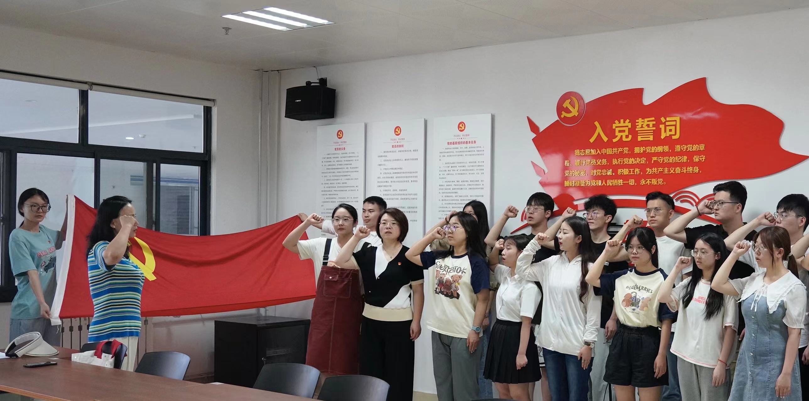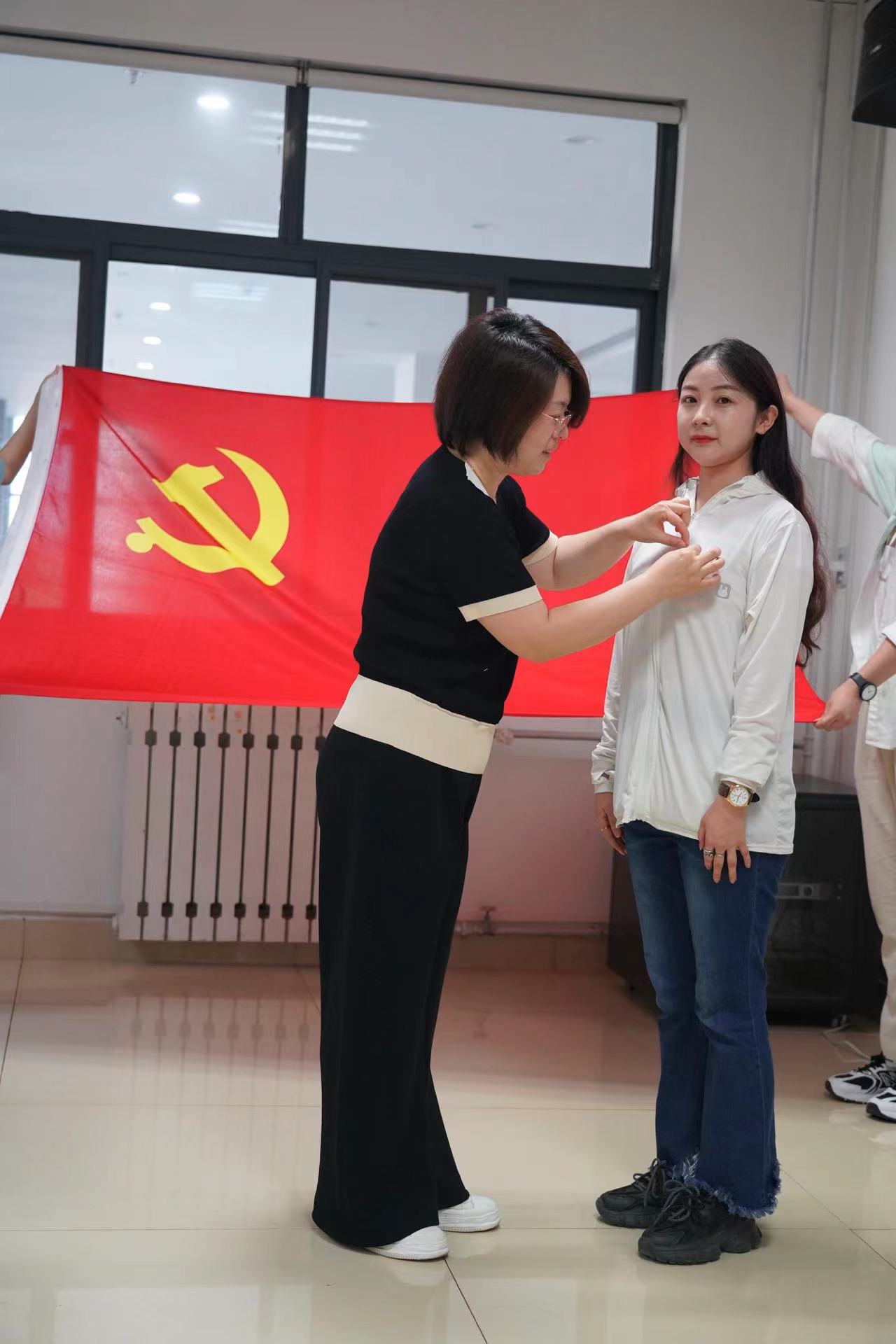 “我志愿加入中国共产党,拥护党的纲领,遵守党的章程,履行党员义务,执行党的决定,严守党的纪律,保守党的秘密,对党忠诚,积极工作,为共产主义奋斗终身,随时准备为党和人民牺牲一切,永不叛党。”在领誓人领读下,全体党员列队肃立,面对党旗进行宣誓。铮铮誓言,拳拳初心,这既是党员们对党的承诺,也是发自内心的对党的忠诚和决心。宣誓结束后,党委书记张茵为新党员逐一佩戴党徽。
