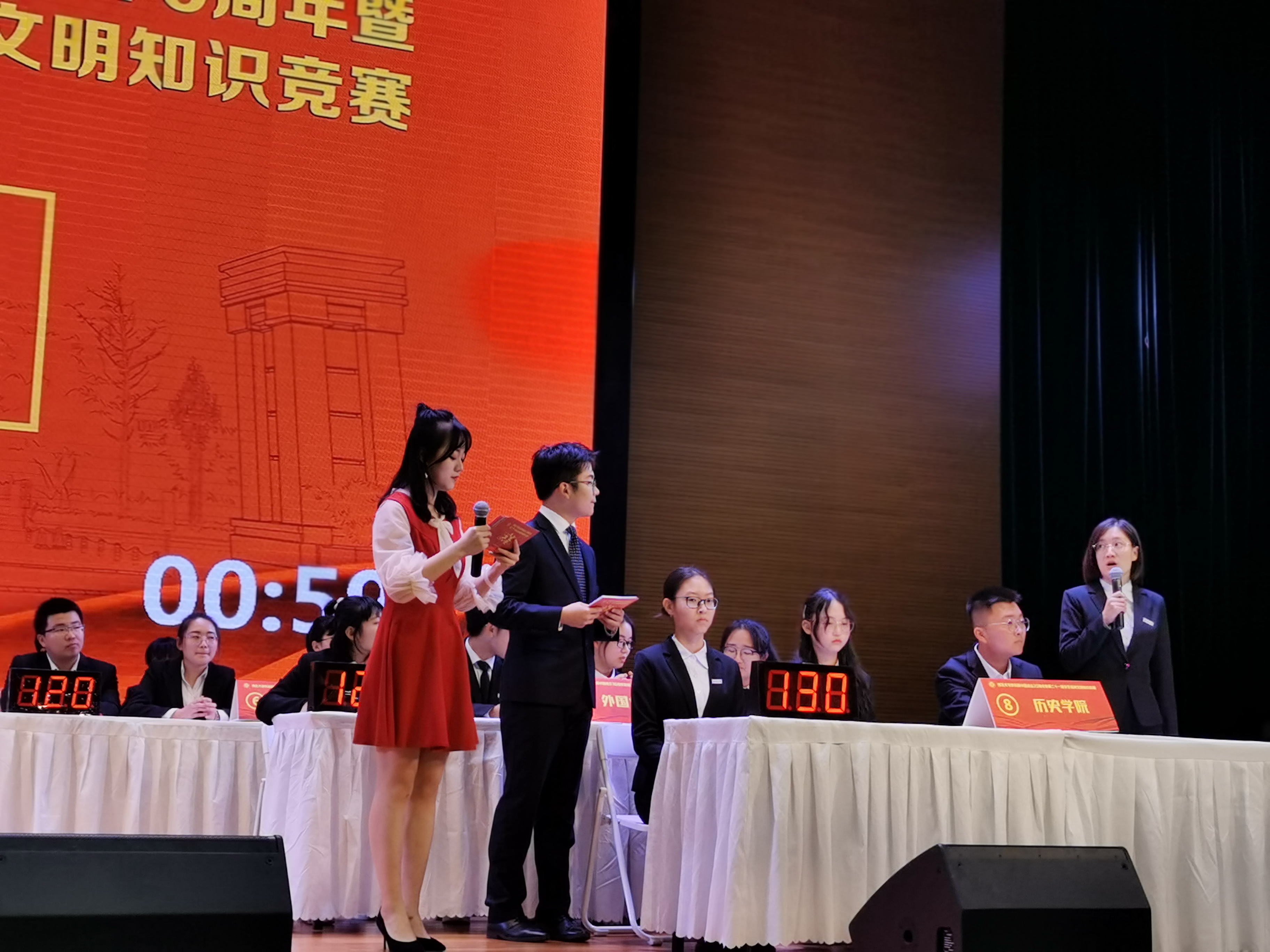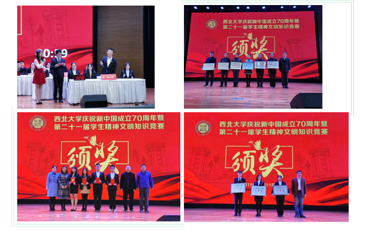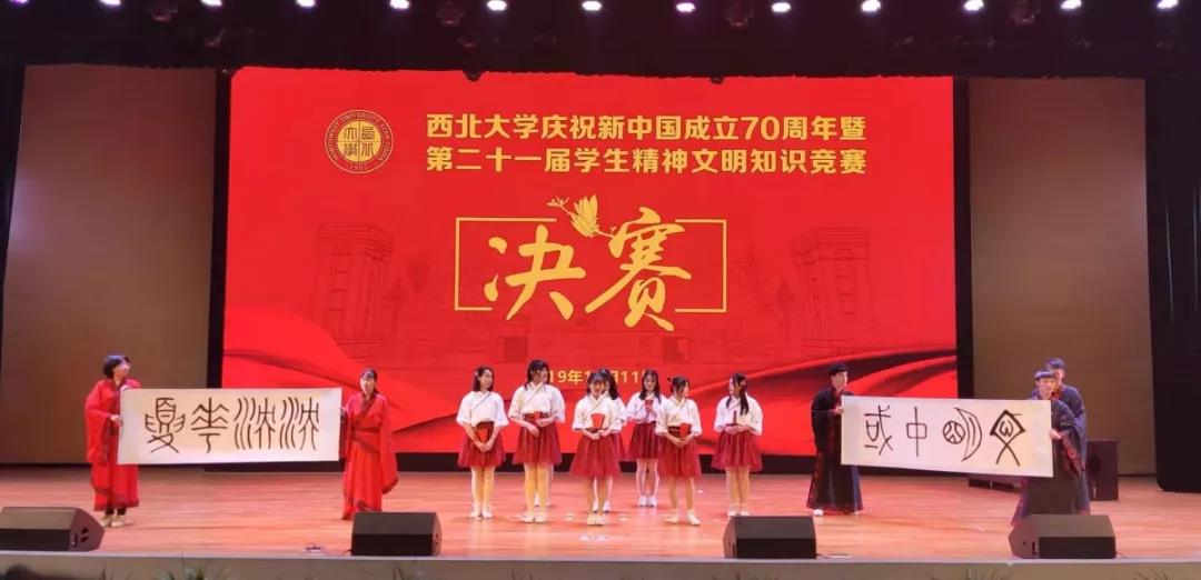 为深入学习贯彻习近平新时代中国特色社会主义思想和党的十九大精神,庆祝新中国成立70周年,巩固和深化2019级新生第一、二阶段入学教育活动成果,在广大学生特别是新生中培育爱国心、树立强国志、厚植荣校情,我校于2019年9月中旬至11月举办了西北大学庆祝新中国成立70周年暨第二十一届精神文明知识竞赛,11月11日晚,决赛在长安校区星空报告厅拉开帷幕。