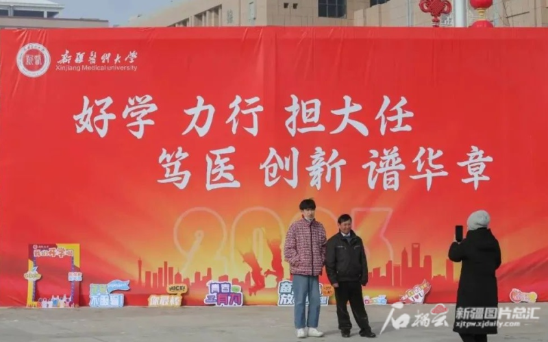 2月18日,新疆医科大学一名新生和家长在校园里拍照打卡。董兵摄