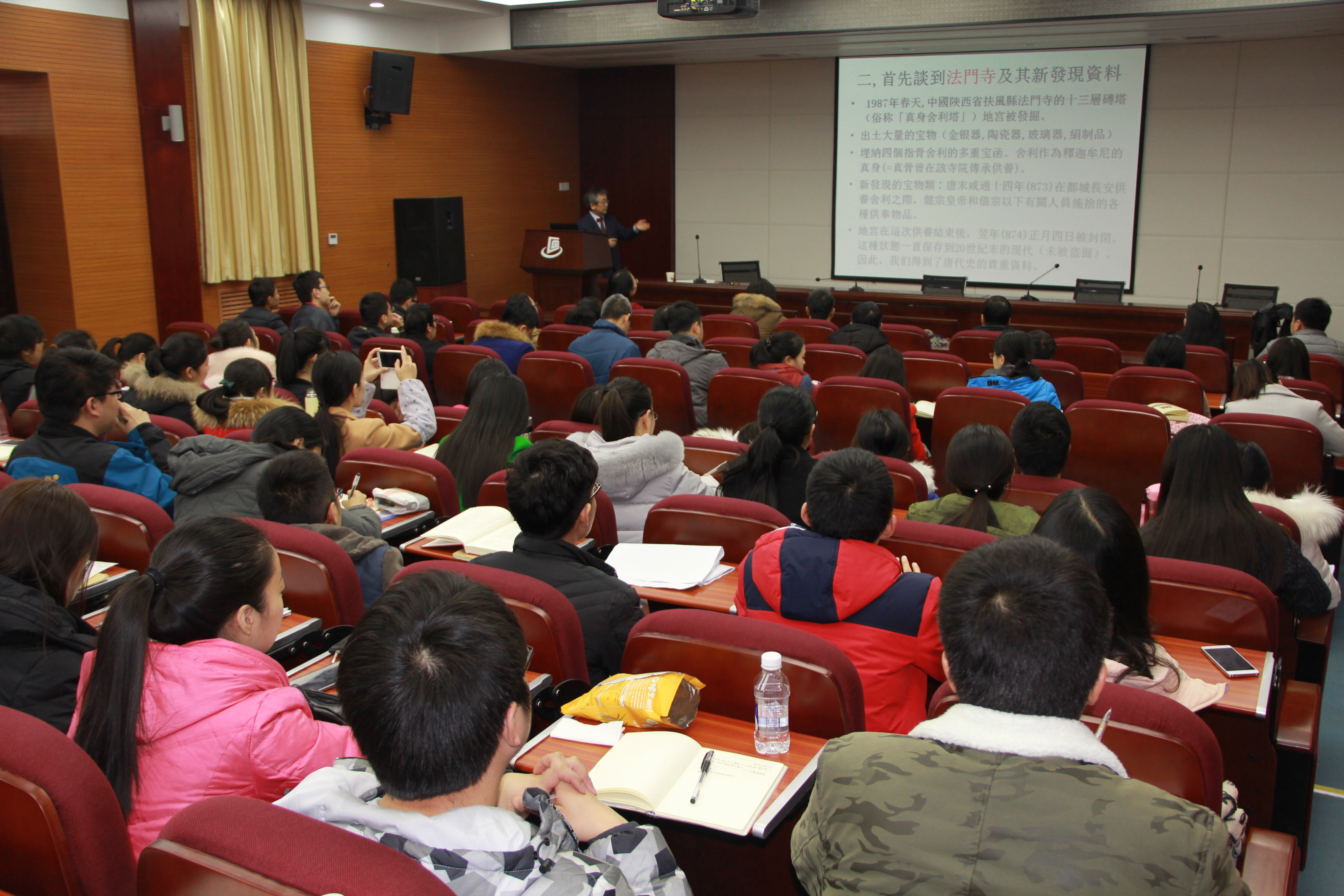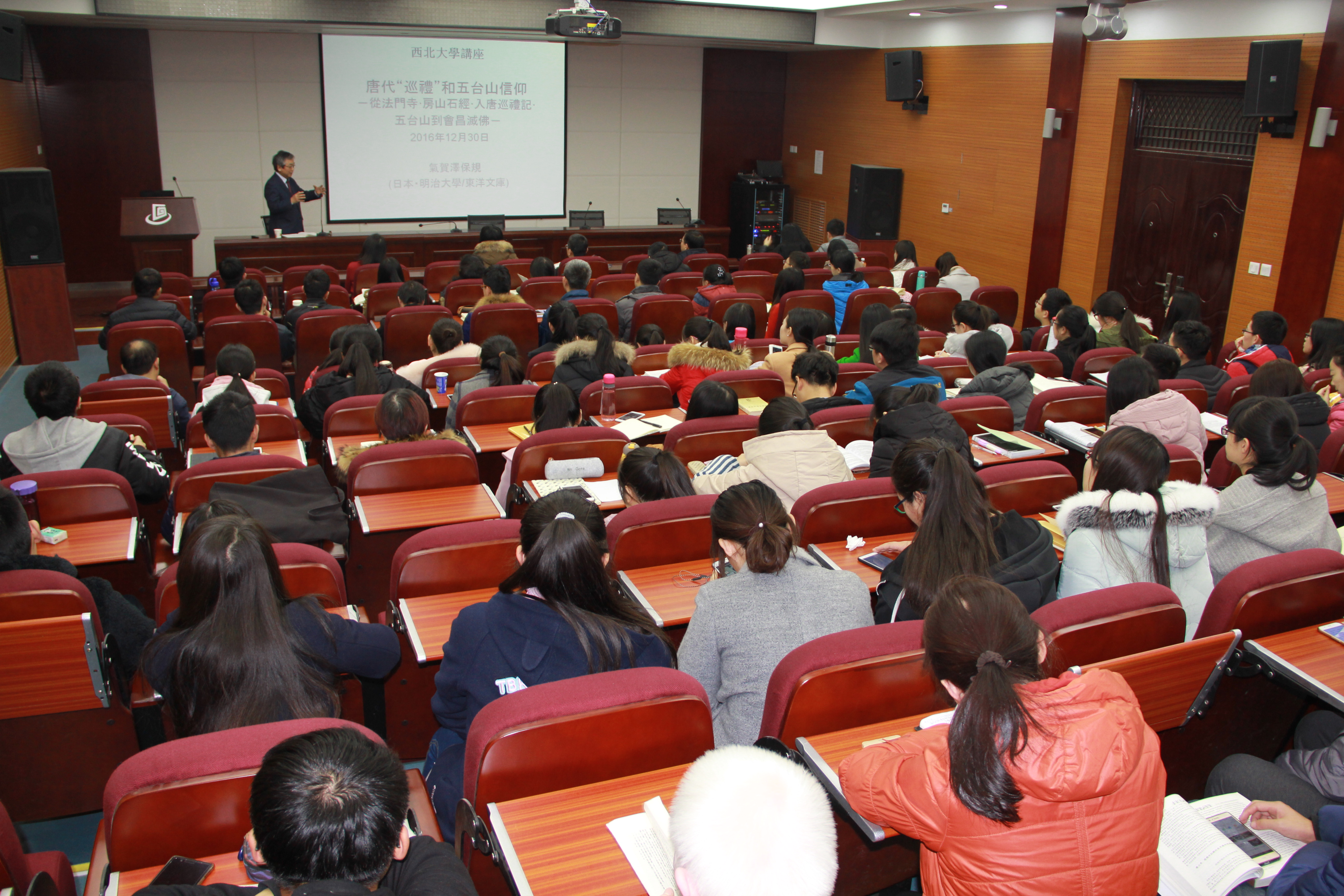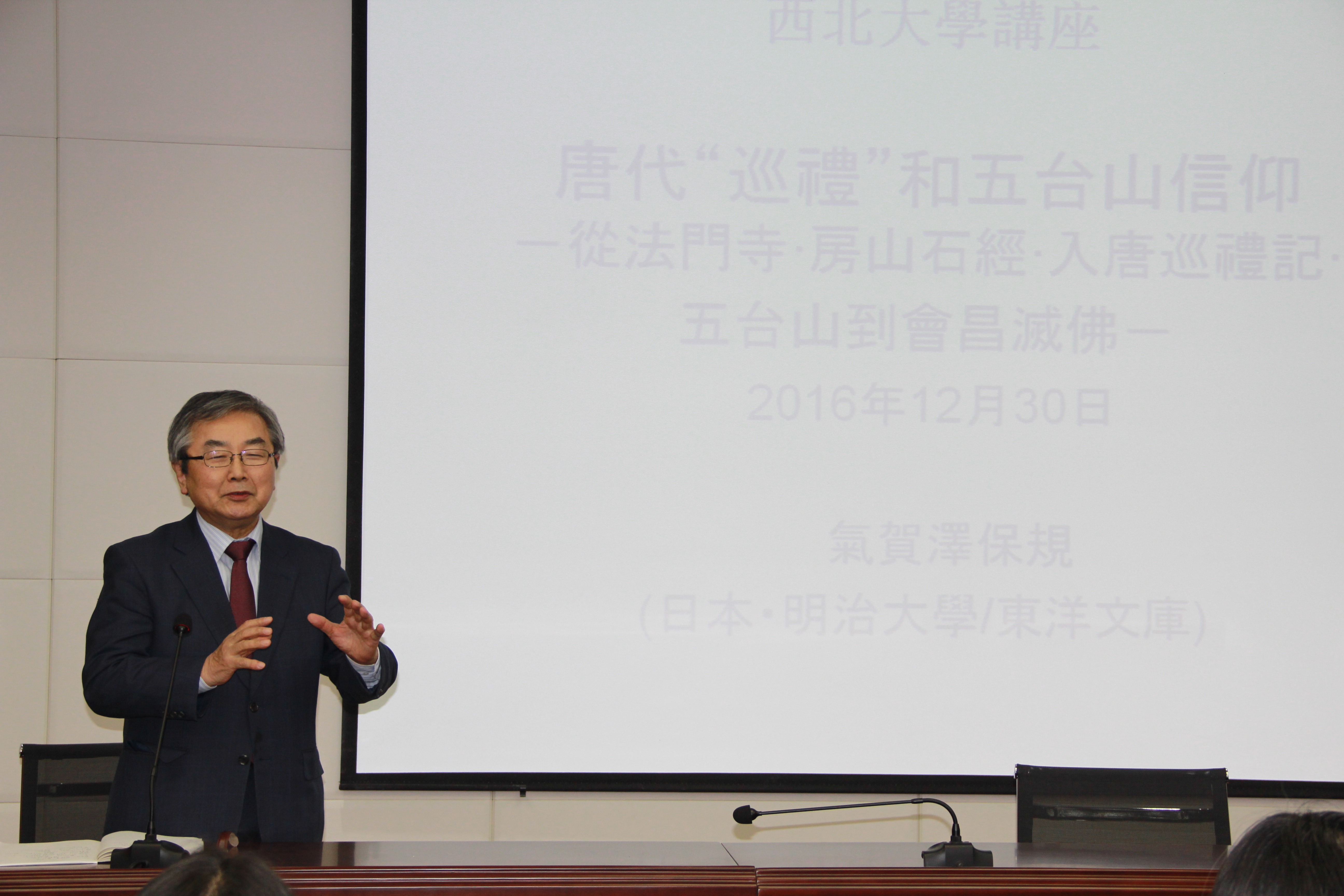 2016年12月30日下午,日本著名唐史学者气贺泽保规教授应邀作客我校“名家讲坛”,为我校师生做了《唐代“巡礼”和五台山信仰》的学术讲座。讲座由我院李军教授主持,现场百余名师生聆听了讲座。