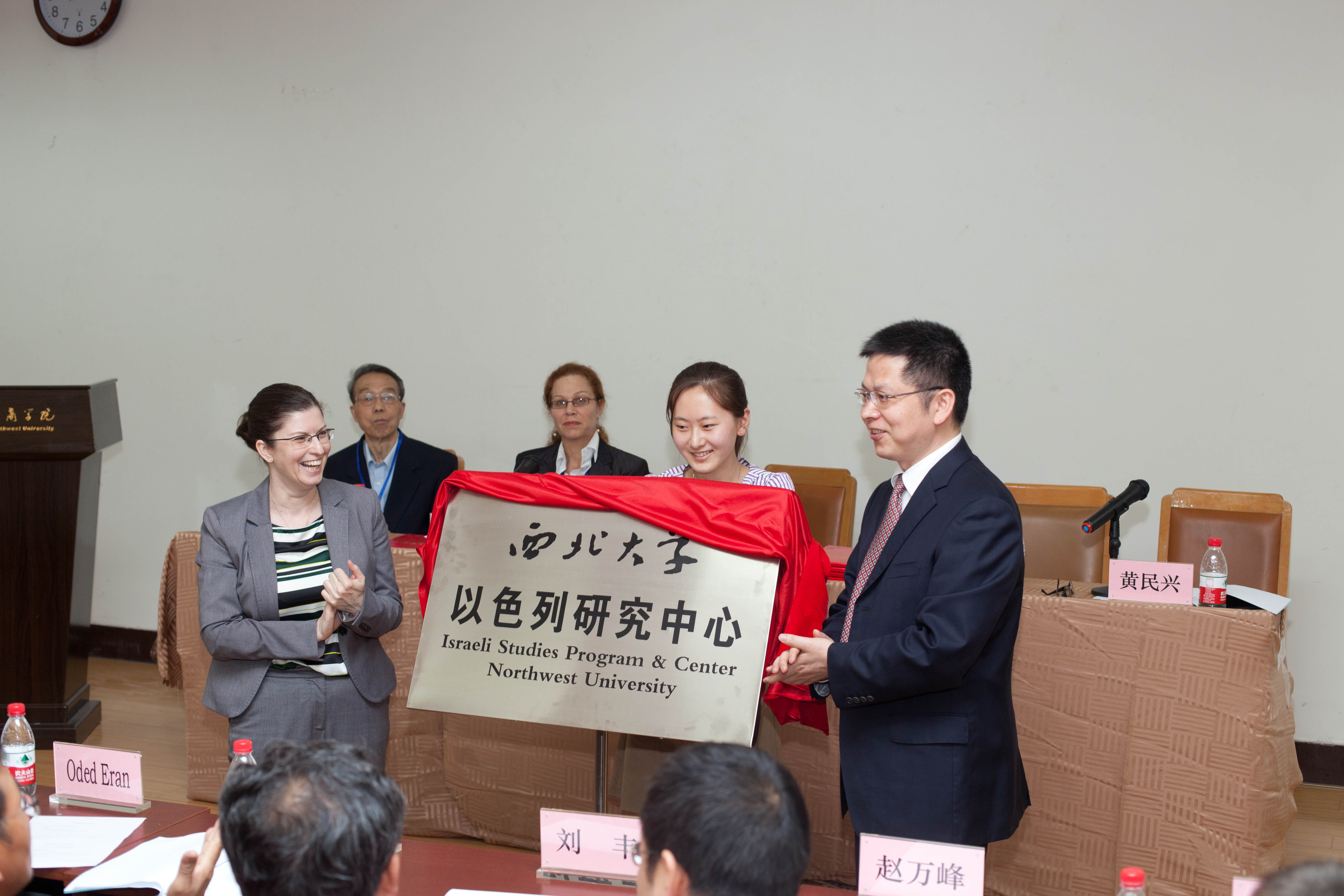 随后,方光华校长和Dana Benvenisti女士共同为西北大学以色列研究中心揭牌。西北大学以色列研究中心挂靠我校历史学院,主要由我校历史学院和中东所相关科研人员组成。聘请历史学院副院长王新刚教授为中心主任,中东所所长黄民兴教授和历史学院雷钰副教授为副主任。中心联合中以学术交流促进会定期举行学术交流活动,支持我校师生加强与以色列相关高校的学术互访,定期在我校举办有关犹太史和以色列研究的征文比赛等。