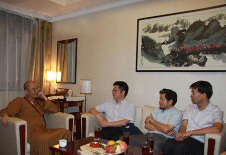会谈中,方光华校长向学诚法师介绍了我校的历史与现状,尤其是宗教研究方面的情况,并对学诚法师在佛教文化方面的杰出贡献给予高度评价,同时表达了对中国佛教文化特征与当代价值、陕西佛教历史地位与现代作用等问题的看法,希望学诚法师对陕西佛教文化能给予更多的关注与支持。李利安教授向学诚法师简要介绍了我校佛教研究所近年来的发展以及陕西佛教文化在近年来所取得的迅速进展。陈峰教授最后就历史学院与法门寺佛学院合作举办宗教学专业佛教方向硕士研究生课程进修班的进展情况做了介绍。