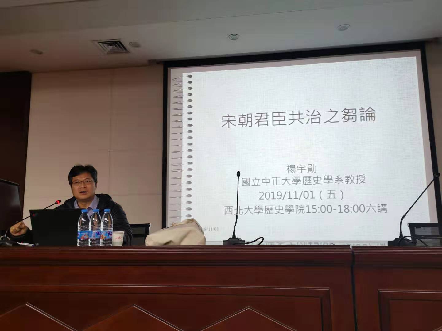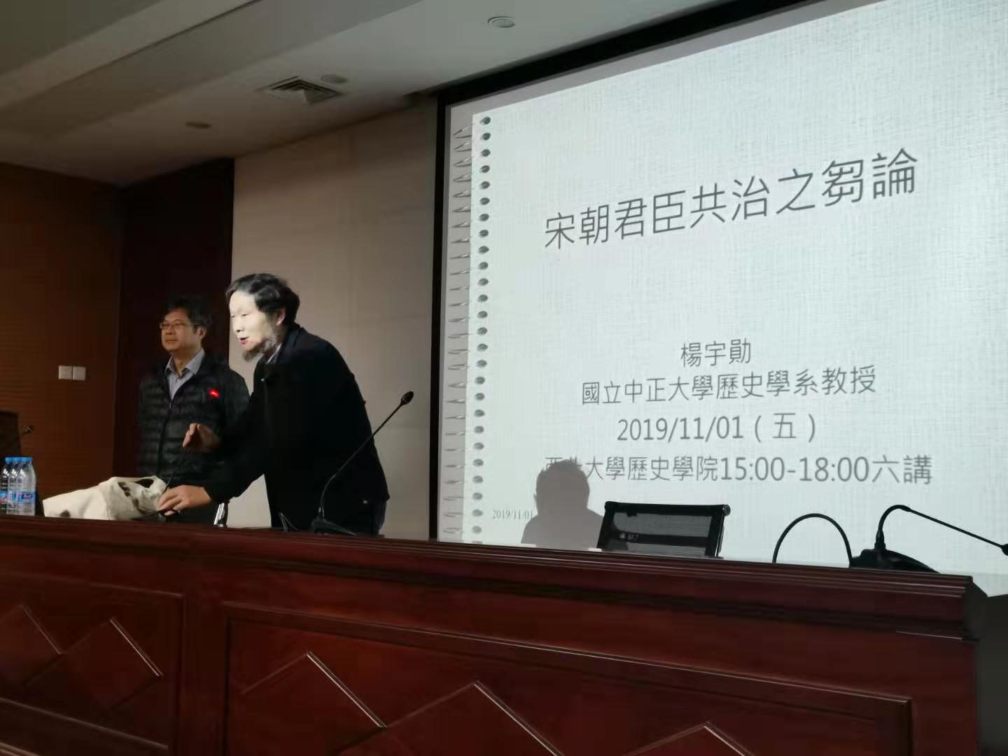 2019年11月1日(周五)下午15:00-18:00,在我校太白校区博望报告厅,应历史学院邀请,来自台湾中正大学的杨宇勋教授以“宋朝君臣共治之刍论”为题,主讲西北大学校庆117周年人文社科高端讲座暨“名家讲坛”。我校历史学院院长陈峰教授主持,历史学院及校内外相关师生多人聆听了此次讲座。