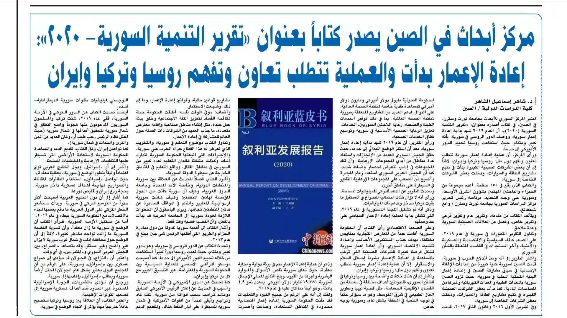 叙利亚国家主流媒体《祖国报》关注我院王新刚教授主编完成《叙利亚发展报告》(2020)