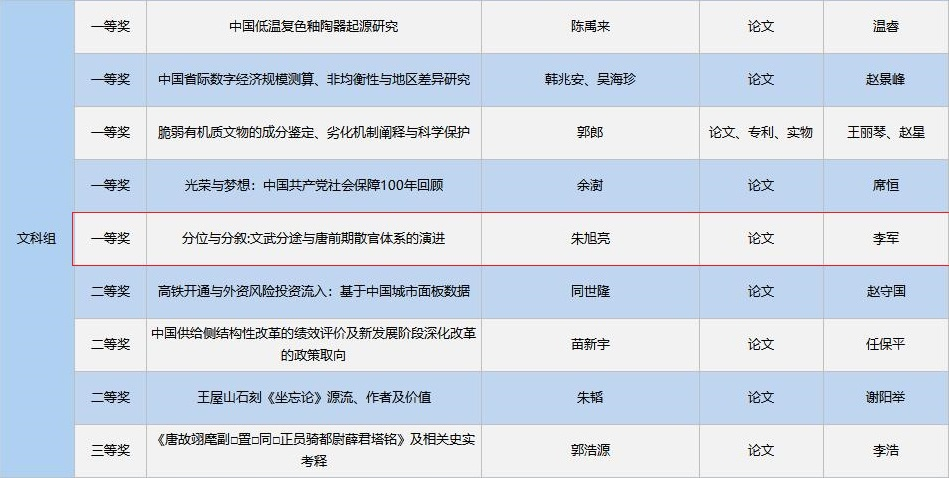近日,陕西省第六届研究生创新成果展优秀作品名单公布,我院推荐的创新成果《分位与分叙:文武分途与唐前期散官体系的演进》获“文科组”一等奖。陕西省研究生创新成果展由省教育厅组织,集中展示省内各研究生培养单位创新人才培养成果,此次获奖充分展现了我院在研究生培养方面的良好成效。
