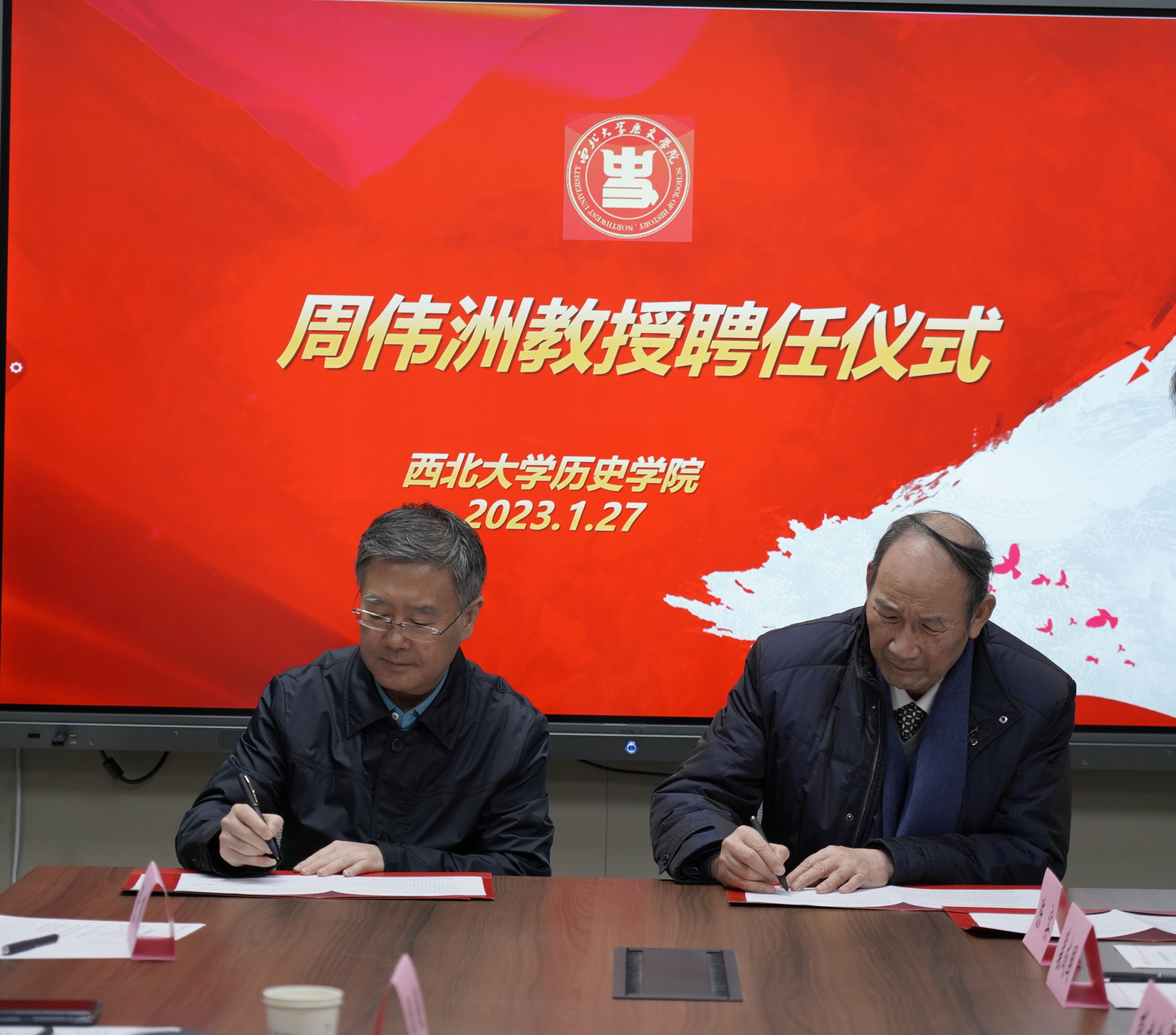 仪式上,人力资源部负责人宣读了西北大学聘任周伟洲教授担任中国民族史团队首席专家决议,郭立宏校长和周伟洲教授共同签署协议。
