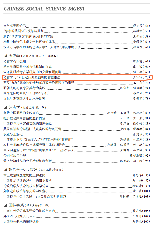 近日,《中国社会科学文摘》2022年第10期转载了我院青年教师卢玲玲的文章《考古学与19世纪后期墨西哥的古史重建》,文章原刊于《首都师范大学学报》(社会科学版)2022年第3期。