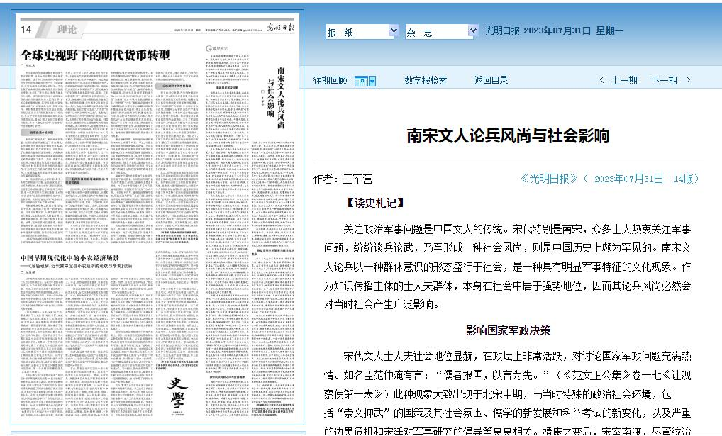 2023年7月31日,我院王军营副教授的论文《南宋文人论兵风尚与社会影响》在《光明日报》理论版刊发。