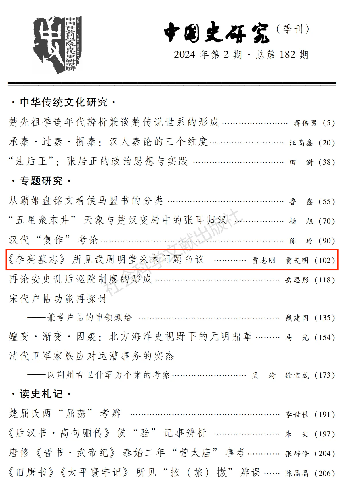 近日,《中国史研究》2024年第2期刊发历史学院贾志刚教授为第一作者的专题论文《<李亮墓志>所见武周明堂采木问题刍议》。