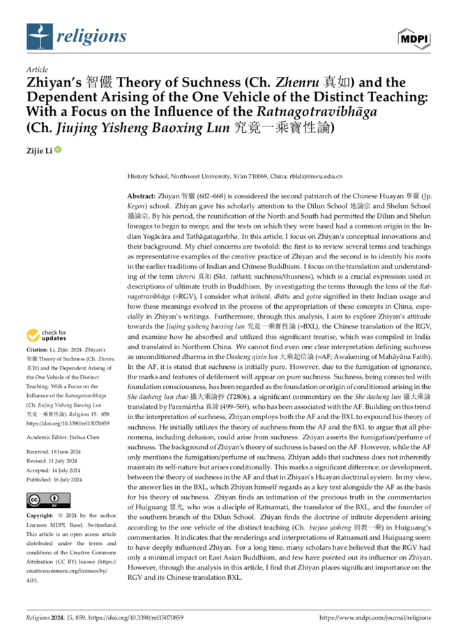 2024年7月16日,英文A&HCI期刊Religions刊发我院李子捷副教授题为 “Zhiyan’s 智儼 Theory of Suchness (Ch. Zhenru 真如) and the Dependent Arising of the One Vehicle of the Distinct Teaching: With a Focus on the Influence of the Ratnagotravibhāga (Ch. Jiujing Yisheng Baoxing Lun 究竟一乘寶性論)” (Religions, vol.15 (7): 859, 2024, DOI:10.3390/rel15070859)的研究论文。该文结合古汉文和梵文资料,立足于中日英三语学界先行研究的基础上,揭示了隋末唐初中国佛教华严宗的代表性人物智俨(602-668)的理论思想背景,尤其是其与成书于古印度的《究竟一乘宝性论》(Ratnagotravibhāga)之间的密切关联,对我们进一步深挖智俨的思想背景乃至隋唐佛教的基本理论问题何以产生提供了少许新的线索。李子捷副教授为本文的唯一作者。该研究得到了国家社会科学基金、教育部国家级博士后相关支持项目和陕西省三秦英才引进计划青年项目的资助。本文是作者继2022年7月之后第二次在Religions独立发表研究论文。