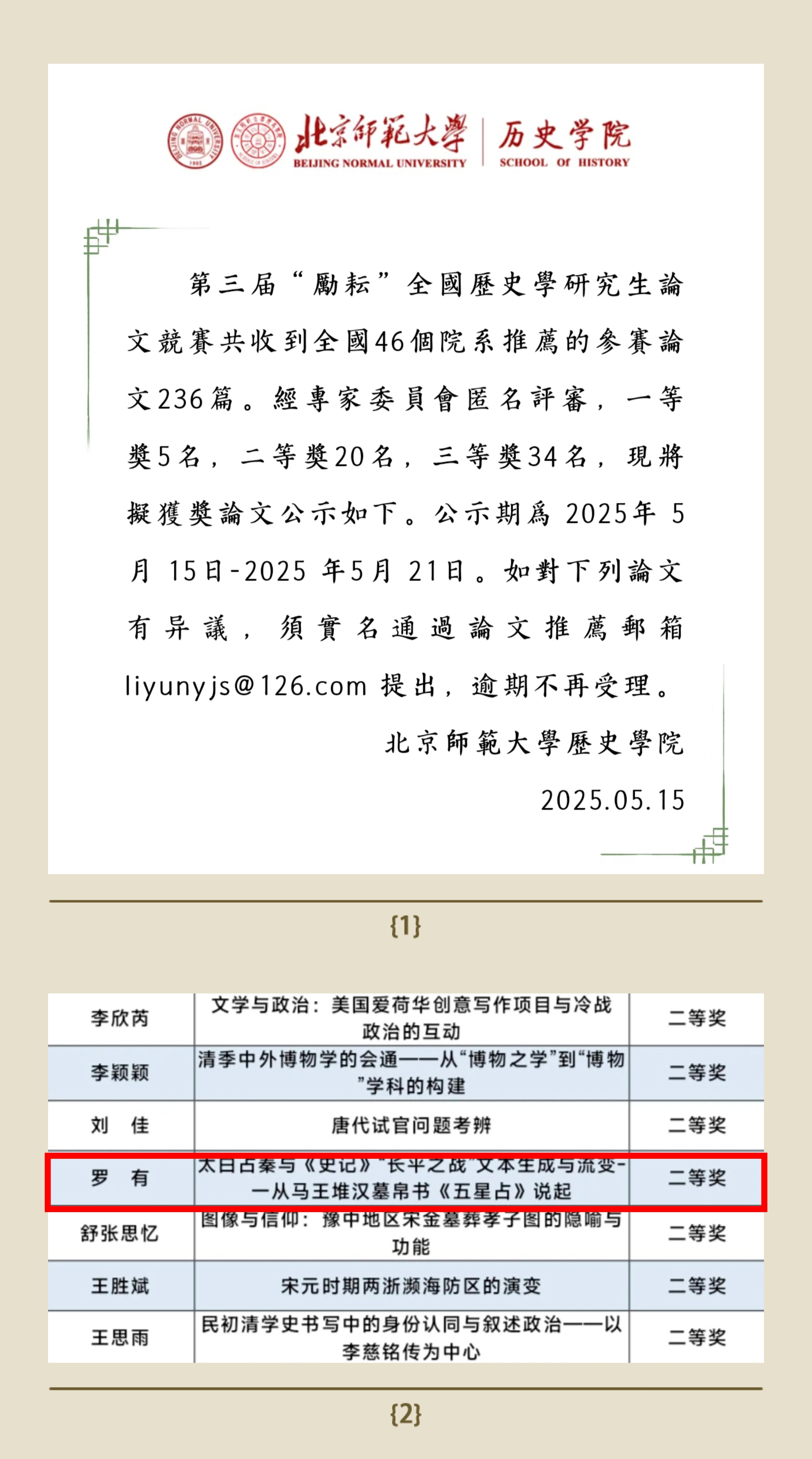 近日,由北京师范大学历史学院主办的第三届“励耘”全国历史学研究生论文竞赛评选结果揭晓,我院23级博士研究生罗有(导师:王子今教授)的论文《太白占秦与〈史记〉“长平之战”文本生成与流变》荣获二等奖。