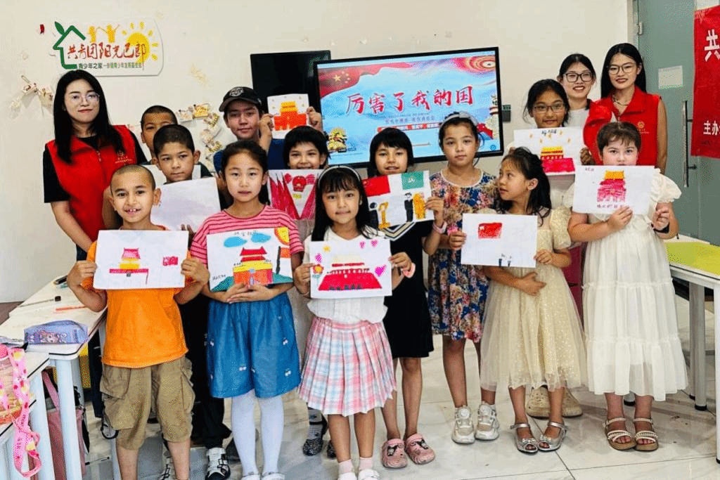 志愿者们带领孩子们走进艺术的殿堂,通过绘画、手工、音乐等活动,培养孩子们的审美情趣和艺术表现力。孩子们在艺术的熏陶下,心灵得到滋养,情操得到陶冶。在“绘出美丽中国”活动中,孩子们用五彩斑斓的画笔描绘出心中的美丽中国,一幅幅充满童趣和想象力的画作,展现了孩子们对祖国的热爱和对美好生活的向往。随后,在“我们的身体会唱歌”活动中,孩子们伴随着欢快的音乐翩翩起舞,感受着音乐的节奏和韵律,用身体表达情感,用舞蹈展现自信。孩子们学习了维吾尔族、哈萨克族、蒙古族等不同民族的舞蹈,感受着不同民族的文化特色,增进了对民族团结的理解和认同。