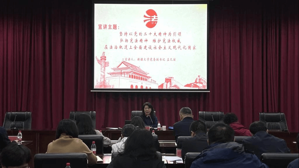 11月2日下午,新疆大学党委副书记孟凡丽以“坚持党的二十大精神为引领弘扬宪法精神维护宪法权威在法治轨道上全面建设社会主义现代化国家”为题开展普法宣讲报告。新疆大学各相关职能部门负责人、各学院党委副书记聆听报告。
