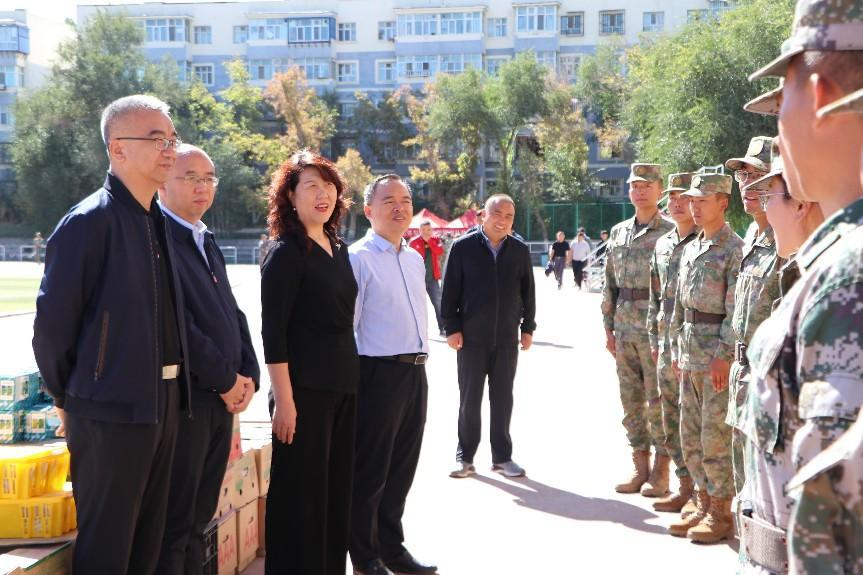 9月4日上午,新疆大学党委副书记孟凡丽,新疆大学党委常委、副校长顾光海及相关职能部门负责人深入军训一线,对参与军训的中国人民解放军某部队官兵及学生教官进行慰问。
