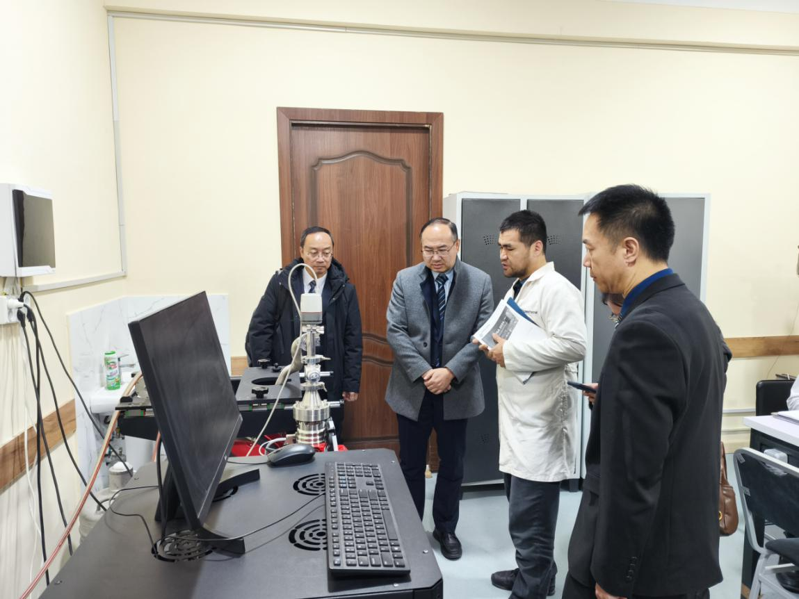 24日上午,代表团一行访问了乌兹别克斯坦撒马尔罕国立大学。撒马尔罕国立大学负责科学事务和创新的副校长哈基姆·胡什瓦克托夫(Hakim Khushvaktov)对晋刚一行的来访表示热烈欢迎,并介绍了学校的发展历史和基本情况,他表示撒马尔罕国立大学作为乌兹别克斯坦历史最悠久、规模最大的高等教育机构之一,目前与国外200多所高校建立了联系,希望能与新疆大学在工程技术、信息技术、生物技术、生态环境保护、物理等领域开展科学研究、人才培养、合作办学、师生互访、中文师资培养等深层次的合作。晋刚对撒马尔罕国立大学的热情接待表示感谢,并简要介绍了新疆大学的基本情况,他表示新疆大学作为以理工学科见长、独具办学特色的综合性大学,与撒马尔罕国立大学在可再生能源、光伏发电、天体物理、材料物理、光学、生物技术、智慧农业、食品工程等领域有着广泛的合作发展空间,希望双方能在联合申报项目、共同开展研究、开展合作办学、加强师生交流等方面密切合作,推动双方的交流与合作达到新水平。与会人员还就下一步组建科研团队、合作开展科研、联合发表论文、联合培养人才等进行了广泛深入的讨论。在校期间,代表团一行参观了撒马尔罕国立大学的光学实验室、材料分析表征实验室等。撒马尔罕国立大学国际合作部主任穆赫塔尔·纳西罗夫(Muhtar Nasirov)、工程物理学院副院长扎维基丁·米尔托舍夫(Zavkiddin Mirtoshev)、农业生物技术和食品安全的萨伊多夫·马马迪约尔(Saidov Mamadiyor)教授、阿卜杜拉希莫夫·明吉吉特(Abdurahimov Mingjigit)教授等部门负责人及专家参加座谈会及相关活动。