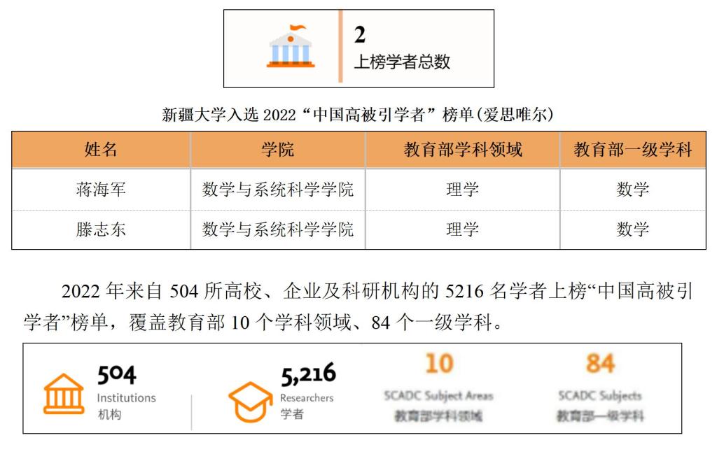 2023年3月28日,爱思唯尔(Elsevier)发布2022年“中国高被引学者” (Highly Cited Chinese Researchers)榜单,新疆大学蒋海军、滕志东教授入选。
